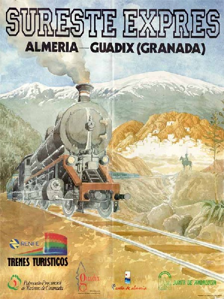Hubo una época, allá por los años 80, en la que la Red Nacional de los Ferrocarriles Españoles apostó por los trenes turísticos como un producto comercial atractivo que conjugaba la visita a ciudades y lugares de interés con el viaje en un tren singular. De todos ellos, además del ya conocido “Tren de la Fresa”, que sigue circulando cada temporada entre Madrid y Aranjuéz, había otros como el “Tren murallas de Ávila”, que partía desde la capital de España hacia la ciudad de Santa Teresa en el famoso “Platanito”, un revolucionario tren basculante de origen italiano, cuyo color amarillo hizo que se conociera por ese mote; y así, otros más como “Tren Doncel de Sigüenza”, “Tren Papa Luna”, “Tren de la Cava”, etc. Almería no quiso ser menos y, durante los meses de marzo y abril de 1990, se incorporó a esta oferta con un tren muy peculiar: El “SURESTE EXPRÉS” que, cómo no, tenía que estar asociado al glorioso pasado cinematográfico, cuando se rodaron tantísimas películas del Oeste en las que el tren siempre estaba presente. El recorrido: Almería – Guadix y regreso se hacia con una locomotora de vapor, un furgón-calderín y cuatro coches “Costa”,o sea, la composición que por entonces realizaba el “Tren de la Fresa”. La locomotora era la “Mikado” 141F2111, de vapor-fuel, entregada a RENFE en 1952 por North British, de Glasgow (Escocia) que, aunque originalmente era de carbón, en 1963 fue transformada para consumir fuel. Apartada del servicio en 1975 al finalizar la época del vapor en España, pasó a formar parte de la colección del recién creado Museo Nacional Ferroviario en 1984 para realizar trenes históricos. El furgón – calderín, de la serie VT 300.000 cumplía una doble función separar la máquina de los coches de viajeros (según el Reglamento de circulación de RENFE un coche de madera con servicio no puede circular con viajeros inmediatamente después de la locomotora) y suministrar al tren vapor para la calefacción si fuese necesario (aunque la máquina de vapor también puede realizar esta función). Para ello cuenta con una caldera alimentada con gasóleo. En cuanto a los coches “Costa”, construidos para los servicios de cercanías de la Compañía MZA (Madrid – Zaragoza y Alicante) entre 1914 y 1930. Se tratan de coches de madera (MZA nunca empleó coches metálicos por considerarlosdemasiado calurosos para sus líneas del sur), montados sobre bogies y dotados de plataformas abiertas con “balconcillo” en los extremos y posibilidad de intercirculación entre coches. El total de plazas era de 320. En el caso del tren almeriense, dado el duro perfil de la línea, en Gádor se acoplaba en cabeza una locomotora eléctrica de la serie 269 que ayudaba a subir las rampas hasta Huéneja-Dólar, fin del trayecto electrificado, continuando con vapor puro hasta entrar majestuosamente en la estación de Guadix. Previamente, en Gérgal, se hacía una parada para asistir a un emocionante espectáculo del Oeste protagonizado por los especialistas cinematográficos del poblado “Mini Hollywood”, situado en Tabernas, que hacía las delicias de los turistas que llenaban el tren. Esta parada era aprovechada para llenar el tanque del ténder de agua mediante la aguada restaurada de la propia estación. Mientras se hacía una visita por la ciudad accitana y la comida de los viajeros, la “Mikado” subía hasta el triángulo de Moreda para orientar la locomotora en sentido Almería y tener el tren preparado para su regreso, realizándose las operaciones técnicas oportunas. Viajar en una de las plataformas con balconcillo durante el trayecto de vuelta era todo un placer, sobre todo en la fuerte bajada entre Gérgal y Santa Fe. El pasaje, gracias al bar de uno de los coches y después de un día de emociones, iba más que animado, disfrutando de un tren único y de un paisaje único. Lástima que no tuviera continuidad, pero eso es otra historia.